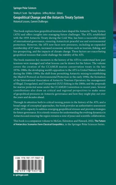 Chapter 1. The Antarctic Treaty System in the Context of Geopolitical, Technological and Environmental Change.- Part I. Historical Case Studies.- Chapter 2. Management of Southern Ocean marine living resources: The origins and development of the Commission for the Conservation of Antarctic Marine Living Resources.- Chapter 3. The tension between regional and universal regimes for Antarctic governance.- Chapter 4. Managing Antarctic tourism: Cooperation between industry and Antarctic Treaty Consultative Parties.- Chapter 5. The CAMLR Convention and IUU Fishing.- Chapter 6. CCAMLR current challenges: Implementation of marine spatial planning for marine biodiversity conservation.- Chapter 7. Antarctic heritage as a nation-building block since 1972.- Part II. Current Geopolitical Tensions in Antarctica and the Southern Ocean.- Chapter 8. Implications of Current Global Tensions on the Effectiveness of the Antarctic Treaty System.- Chapter 9. Environmental change and geopolitical tension in the Antarctic Treaty System.- Chapter 10. Consensus under pressure in CCAMLR: Suggesting rigour and clarity in process and interpretation to help alleviate internal and external pressures.- Chapter 11. Non-militarisation of Antarctica: Geopolitical foundations and challenges.- Chapter 12. Geopolitical changes and futures of CCAMLR.- Chapter 13. Sub-Antarctic Islands: Sovereignty issues.- Chapter 14. Mining in Antarctica to 2048 and beyond.- Part III. Perspectives on Antarctic Geopolitics.- Chapter 15. Classical geopolitics and Antarctica.- Chapter 16. Feminist perspectives.- Chapter 17. Chinese perspectives on Antarctic geopolitics.- Chapter 18. A South American Perspective on Antarctic Geopolitics.- Chapter 19. An Indian Perspective on Antarctic Geopolitics: Balancing between Normative and Instrumental Imperatives.- Part IV. Conclusions.- Chapter 20. Synthesis and lessons drawn.