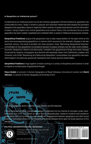 Condemned as an intellectul poison by the late American geographer Richard Hartshbornem geopolitics has confounded its critics. Today it remains a popular and important intellectul field despite the persistent allegations that geopolitics helped to legitimate Hitler's policies of spatial expansionism and the domination of place. Using insights from critical geopolitics and cultural history, the contributoirs focus on how geopolitics has been created, negotiated and contested within a variety of intellectual and popular contexts. Geopolitical Traditions argues that geopolitics has to take responsibility for the past whilst at the same time reconceptualising geopolitics in a manner which accounts for the dramatic changes in the late twentieth century. The book is divided into three sections: firstly Rehtinking Geopolitical Histories concentrates on how geopolitical conversations between European scholars and the wider world unfolded; secondly Geopolitics, Nationa and Spirituality considers how geopolitical writings have been strongly influenced by religions, iconography adn doctrine with examples drawn from Catholicicsm, Judaism and Hinduism; and thirdly Reclaiming and Refocusing Geopolitics contemplates how geopolitics has been reformulated in the post-war period with illustrations from France and the United States. Geopolitical Traditions brings together scholars working in a variety of disciplines and locations in order to explore a hundred years of geopolitical thought. Sanjay Chaturedi Punjab University, India. Paul Claval, Eaubonne, France . Michael J. Heffernan Notingham University, UK, Les Hepple University of Bristol.