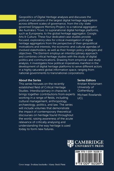 Geopolitics of Digital Heritage analyzes and discusses the political implications of the largest digital heritage aggregators across different scales of governance. The Element employs an interdisciplinary approach and combines critical heritage studies with the study of digital politics and communications.