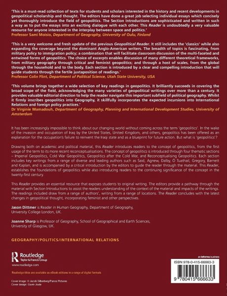Section 1: Imperial Geopolitics 1. The Influence of Seapower on History Alfred Thayer Mahan 2. The Geographical Pivot of History Halford Mackinder 3. Influences of Geographic Environment Ellen Churchill Semple 4. Geopolitics and Empire Gerry Kearns 5. What Geography Ought To Be Peter Kropotkin 6. Some Rules of Satyagraha Mohandas Gandhi 7. Why Geopolitik? Karl Haushofer 8. Eastern Orientation or Eastern Policy Adolf Hitler 9. Geography versus Geopolitics Isaiah Bowman 10. Japanese Geopolitics in the 1930s and 1940s Keiichi Takeuchi 11. Orientalism Edward Said 12. America is Safe While its Boys and Girls Believe its Creeds! Jason Dittmer Section 2: Cold War Geopolitics 13. The Sources of Soviet Conduct George Kennan 14. The Domino Principle Dwight D. Eisenhower 15. Anti-Domino Patrick O'Sullivan 16. Diplomacy Henry Kissinger 17. Brezhnev Doctrine Leonid Brezhnev 18. Non-alignment in the 1970s Julius Nyerere 19. An Illustration of Geographical Warfare Yves Lacoste 20. Policy Statement Committee on the Present Danger 21. Geopolitics and Discourse Gearoid Ó Tuathail and John Agnew 22. Publishing American Identity Joanne Sharp 23. Homeward Bound Elaine Taylor May 24. Between Regions: Science, Militarism, and American Geography from World War to Cold War Trevor Barnes and Matthew Farish 25. Common European Home Mikhail Gorbachev Section 3: Geopolitics After the Cold War 26. Clash of Civilisations Samuel Huntington 27. Clash of Ignorance Edward Said 28. The Coming Anarchy Robert Kaplan 29. Reading 'The Coming Anarchy' Simon Dalby 30. The Pentagon's New Map Thomas Barnett 31. Neoliberal Geopolitics Sue Roberts, Anna Secor and Matt Sparke 32. The Colonial Present Derek Gregory 33. What Counts as the Politics and Practice of Security, and Where? Matthew Coleman 34. Geopolitics by Another Name Caroline Nagel 35. Emerging China and Critical Geopolitics John Agnew 36. The Uncertain state(s) of Europe Luisa Bialasiewicz 37. The New Geopolitics of Disease: Between Global Health and Global Security Allan Ingram 38. Geopolitical Economy of Resource Wars Phillippe Le Billon 39. Icy Geopolitics Klaus Dodds Section 4: Reconceptualising Geopolitics A Feminist Geopolitics? Lorraine Dowler and Joanne Sharp 40. Globalized Fear? Rachel Pain 41. Geopolitics and Family in Palestine Chris Harker 42. The Question of 'The Political' in Critical Geopolitics Jennifer Hyndman 43. Affectivity and Geopolitical Images Sean Carter and Derek McCormack 44. After Geopolitics? Deborah Cowen and Neil Smith 45. Religion and Geopolitics John Agnew 46. Militarism, Just War, or Nonviolence? Nick Megoran 47. Anthropocene Geopolitics Simon Dalby 48. In Defence of the Heartland Colin Gray 49. The Revenge of Geography Robert Kaplan