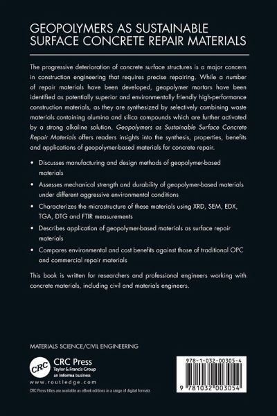 1. Concrete Durability and Surface Deterioration. 2. Geopolymer as Emerging Repair Materials. 3 Manufacturing Geopolymer: Materials and Mix Design. 4. Factors Effect on the Manufacturing of Geopolymer. 5. Performance Criteria of Geopolymer as Repair Materials. 6. Compatibility of Geopolymer for Concrete Surface Repair. 7. Effects of Aggressive Environments on Geopolymer Performance as Repair Materials. 8. Performance Evaluation of Geopolymer as Repair Materials Under Freeze-Thaw Cycles 9. Methods of Evaluating the Geopolymer Efficiency as Alternative Concrete Surface Repair Materials Compared to Commercials Products. 10. Sustainability of Geopolymer as Repair Materials