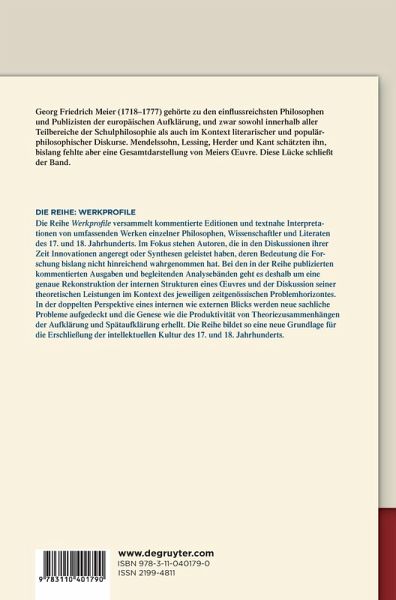 Georg Friedrich Meier (1718-1777) gehörte zu den prägenden Philosophen und Publizisten der europäischen Aufklärung zwischen 1750 und 1780, und zwar sowohl innerhalb aller Teilbereiche der Fach- und Schulphilosophie als auch im Kontext literarischer und populärphilosophischer Diskurse.