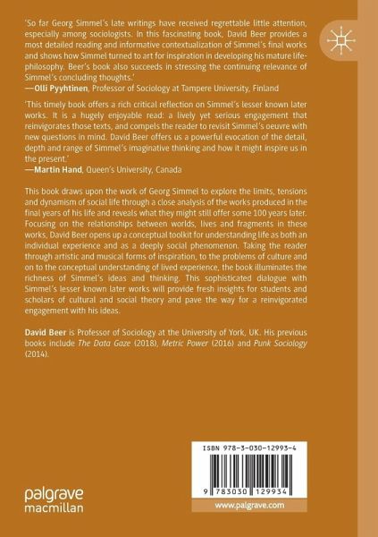 This book draws upon the work of Georg Simmel to explore the limits, tensions and dynamism of social life through a close analysis of the works produced in the final years of his life and reveals what they might still offer some 100 years later. Focusing on the relationships between worlds, lives and fragments in these works, David Beer opens up a conceptual toolkit for understanding life as both an individual experience and as a deeply social phenomenon. Taking the reader through artistic and musical forms of inspiration, to the problems of culture and on to the conceptual understanding of lived experience, the book illuminates the richness of Simmel's ideas and thinking. This sophisticated dialogue with Simmel's lesser known later works will provide fresh insights for students and scholars of cultural and social theory and pave the way for a reinvigorated engagement with his ideas.