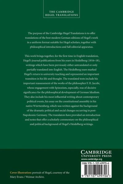 This volume brings together, for the first time in English translation, Hegel's journal publications from his years in Heidelberg (1816â 18). The translators have provided an introduction and notes that offer a scholarly commentary on the philosophical and political background of Hegel's Heidelberg writings.