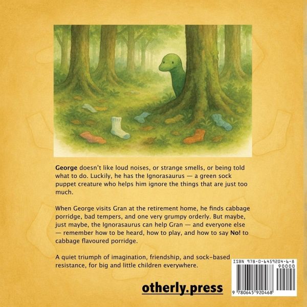 George doesn't like loud noises, or strange smells, or being told what to do. Luckily, he has the Ignorasaurus - a green sock puppet creature who helps him ignore the things that are just too much. When George visits Gran at the retirement home, he finds cabbage porridge, bad tempers, and one very grumpy orderly. But maybe, just maybe, the Ignorasaurus can help Gran - and everyone else - remember how to be heard, how to play, and how to say No! to cabbage flavoured porridge. A quiet triumph of imagination, friendship, and sock-based resistance, for big and little children everywhere.