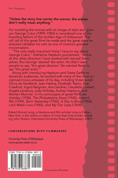 For investing movies with an image of style and glamour George Cukor (1899-1983) is considered one of the founding fathers of the Golden Age of Hollywood. The roll call of the great films he made and the stars he directed validates his rank as one of cinema's greatest moviemakers. "The only really important thing I have to say about George Cukor," Katharine Hepburn proclaimed, "is that all the other directors I have worked with starred themselves. But George 'starred' the actor. He didn't want people to say, 'this great director.' He wanted them to say, 'this great actor.'" Along with introducing Hepburn and Greta Garbo to American audiences, he worked with many of the most acclaimed movie actresses of his day, including Vivien Leigh, Olivia de Havilland, Jean Harlow, Elizabeth Taylor, Joan Crawford, Ingrid Bergman, Ava Gardner, Claudette Colbert, Angela Lansbury, Judy Holliday, Audrey Hepburn, and Marilyn Monroe. These interviews are a pleasure to read because Cukor is so immersed in his subject and so forthright in his observations. He comes to life immediately with disarming candor and infectious enthusiasm for cinema and the people who make it. In addition to discussing his romantic comedies, Cukor talks about his famous screen adaptations of classic novels and plays, including Little Women (1933) and David Copperfield (1935). His experience of being fired by producer David O. Selznick partway through the shooting of Gone With the Wind (1939) surfaces in nearly every interview. Instead of having his career derailed by this dismissal, however, he continued his rise as one of America's premier directors. In his cornucopia of films are Holiday (1938), The Philadelphia Story (1940), Adam's Rib (1949), Born Yesterday (1950), A Star Is Born (1954), Let's Make Love (1960), and My Fair Lady (1964). Cukor was a man of myriad dimensions. In his last years he opened up about his private life and his previously undisclosed homosexuality. He was ardent in his friendships and single-minded in his devotion to making quality movies for a popular audience.