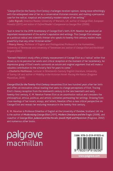 George Eliot for the Twenty-First Century reexamines Eliot two hundred years after her birth and offers an innovative critical reading that seeks to change perceptions of Eliot. Tracing Eliot's literary reception from the nineteenth century to the late twentieth and early twenty-first century, K. M. Newton frames Eliot as an unorthodox radical and considers the philosophical, ethical, political, and artistic subtleties permeating her writings. Drawing from close readings of her novels, essays, and letters, Newton offers a new critical perspective on George Eliot and reveals her enduring relevance in the twenty-first century.