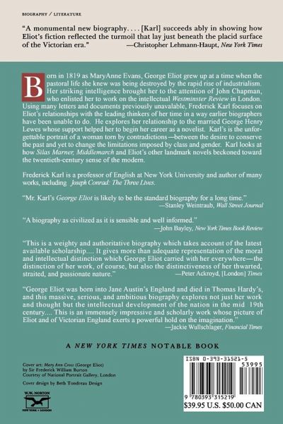 Frederick R. Karl's magisterial biography of George Eliot proves her to be one of the most fascinating and iconic individuals of her time. Born in 1819 as Mary Anne Evans, she grew up near rural Coventry when the pastoral life was being destroyed by the rapid rise of industrialism. Her father, Robert Evans, took care of an estate, where the family lived. Eliot, his youngest child, absorbed the world around her, its beauty and its delicate sense of stability, which was about to be thoroughly disrupted. Eliot thrived on learning while she stayed home, taking care of her aging father. Upon his death, she began her long process of emergence and change. Her unusual intelligence and literary capacity brought her to the attention of John Chapman, who enlisted her to work on the intellectual Westminster Review in London. While there she met some of the leading thinkers of her era, including Herbert Spencer. Karl focuses on her relationships with these men in a way earlier biographers have been unable, using many letters and documents previously unavailable.