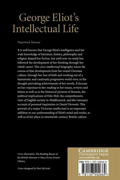 It is well known that George Eliot's intelligence and her wide knowledge of literature, history, philosophy and religion shaped her fiction, but until now no study has followed the development of her thinking through her whole career. This intellectual biography traces the course of that development from her initial Christian culture, through her loss of faith and working out of a humanistic and cautiously progressive world view, to the thought-provoking achievements of her novels. It focuses on her responses to her reading in her essays, reviews and letters as well as in the historical pictures of Romola, the political implications of Felix Holt, the comprehensive view of English society in Middlemarch, and the visionary account of personal inspiration in Daniel Deronda. This portrait of a major Victorian intellectual is an important addition to our understanding of Eliot's mind and works, as well as of her place in nineteenth-century British culture.