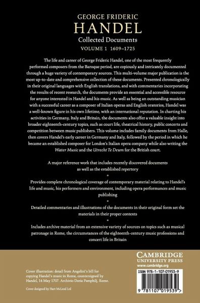 The life and career of George Frideric Handel, one of the most frequently performed composers from the Baroque period, are copiously and intricately documented through a huge variety of contemporary sources. This multi-volume major publication is the most up-to-date and comprehensive collection of these documents. Presented chronologically in their original languages with English translations and with commentaries incorporating the results of recent research, the documents provide an essential and accessible resource for anyone interested in Handel and his music. As well as being an outstanding musician with a successful career as a composer of Italian operas and English oratorios, Handel was a well-known figure in his own lifetime, with an international reputation. In charting his activities in Germany, Italy and Britain, the documents also offer a valuable insight into broader eighteenth-century topics, such as court life, theatrical history, public concerts and competition between music publishers. This volume includes family documents from Halle, then covers Handel's early career in Germany and Italy, followed by the period in which he became an established composer for London's Italian opera company while also writing the Water Music and the Utrecht Te Deum for the British court.