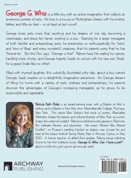 George G. Whiz is a little boy with an active imagination that collects an enormous number of pets. He lives in a house on Nottingham Street, with his mother, father, and fifty-six feet - or at least at last count! George loves pets more than anything and he dreams of one day becoming a veterinarian, and brave lion tamer, working in a zoo. Yearning for a larger menagerie of both familiar and extraordinary pets, he perseveres so enthusiastically for 'twins' and 'trios of fleas' and many wonderful creatures, that his parents worry that he has 'Animal-itis'. But the Doc says, "George is fine!" Parrots have him eating his carrots, handling more chores, and George happily heads to school with his new pet, Noah, for a grand finale like no other! Filled with rhymed laughter, this colorfully illustrated witty tale, about a boy named George, leads readers on a delightfully imaginative adventure. As George dreams of filling his home with a variety of pets, ordinary and extraordinary, his parents discover the advantages of George's increasing menagerie, as he grows to be responsible and agreeable.
