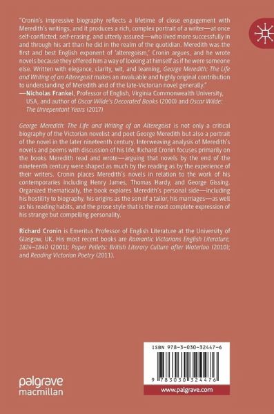 George Meredith: The Life and Writing of an Alteregoist is not only a critical biography of the Victorian novelist and poet George Meredith but also a portrait of the novel in the later nineteenth century. Interweaving analysis of Meredith's novels and poems with discussion of his life, Richard Cronin focuses primarily on the books Meredith read and wrote-arguing that novels by the end of the nineteenth century were shaped as much by the reading as by the experience of their writers. Cronin places Meredith's novels in relation to the work of his contemporaries including Henry James, Thomas Hardy, and George Gissing. Organized thematically, the book explores Meredith's personal side-including his hostility to biography, his origins as the son of a tailor, his marriages-as well as his reading habits, and the prose style that is the most complete expression of his strange but compelling personality.