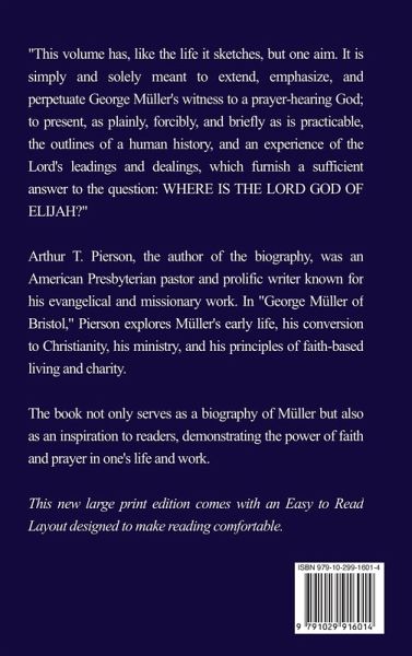 "This volume has, like the life it sketches, but one aim. It is simply and solely meant to extend, emphasize, and perpetuate George Müller's witness to a prayer-hearing God; to present, as plainly, forcibly, and briefly as is practicable, the outlines of a human history, and an experience of the Lord's leadings and dealings, which furnish a sufficient answer to the question: WHERE IS THE LORD GOD OF ELIJAH?" Arthur T. Pierson, the author of the biography, was an American Presbyterian pastor and prolific writer known for his evangelical and missionary work. In "George Müller of Bristol," Pierson explores Müller's early life, his conversion to Christianity, his ministry, and his principles of faith-based living and charity. The book not only serves as a biography of Müller but also as an inspiration to readers, demonstrating the power of faith and prayer in one's life and work. This new large print edition comes with an Easy to Read Layout designed to make reading comfortable.