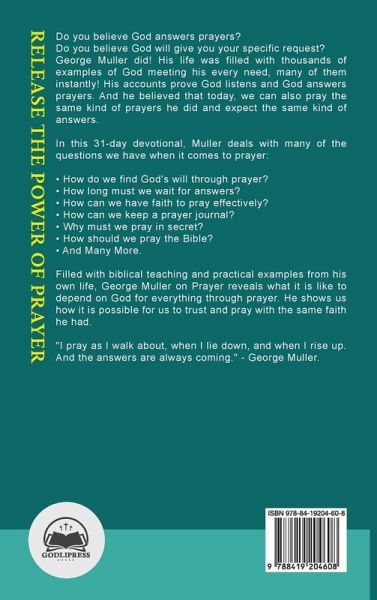 31 Prayer Insights for Developing an Intimate Relationship with God. Do you believe God answers prayers? Do you believe God will give you your specific request? George Muller did! His life was filled with thousands of examples of God meeting his every need, many of them instantly! His accounts prove God listens and God answers prayers. And he believed that today, we can also pray the same kind of prayers he did and expect the same kind of answers. In this 31-day devotional, Muller deals with many of the questions we have when it comes to prayer:How do we find God's will through prayer? How long must we wait for answers? How can we have faith to pray effectively? How can we keep a prayer journal? Why must we pray in secret? How should we pray the Bible? Filled with biblical teaching and practical examples from his own life, George Muller on Prayer reveals what it is like to depend on God for everything through prayer. He shows us how it is possible for us to trust and pray with the same faith he had. "I pray as I walk about, when I lie down, and when I rise up. And the answers are always coming." - George Muller.