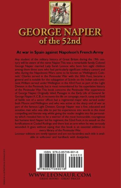 At war in Spain against Napoleon's French Army Any student of the military history of Great Britain during the 19th century will be aware of the name Napier. This was a remarkable family. Colonel George Napier married Lady Sarah Lennox who bore him eight children among them three sons who had particularly significant military careers and who during the Napoleonic Wars came to be known as 'Wellington's Colonels.' Charles served in the Peninsular War with the 50th Foot, became a general and is notable for the subjugation of Scinde on the Indian sub-continent. William served under Wellington in the 43rd Foot as part of the Light Division in the Peninsula, but is most remembered for his superlative history of the Peninsular War. This book concerns the Peninsular War experiences of George Napier. Originally titled, Passages in the Early Life of General Sir George Napier,K.C.B., it recounts the life on campaign, march, camp and field of battle not of a senior officer, but a regimental major who served under both Moore and Wellington and who was active at the sharp end of war as part of the famous Light Division. George Napier was a fine, educated and sensitive man who was able to put his experiences into words in the most compelling and literate way, whilst giving the reader insights into his personality which revealed him to be a warrior of the most honourable, courageous but humane kind. Napier led his regiment, the 52nd Foot, in its assault on the fortifications at Ciudad Rodrigo and there lost an arm when he was seriously wounded. It goes without saying that this book is an essential addition to every library of the Peninsular War. Leonaur editions are newly typeset and are not facsimiles; each title is available in softcover and hardback with dustjacket.
