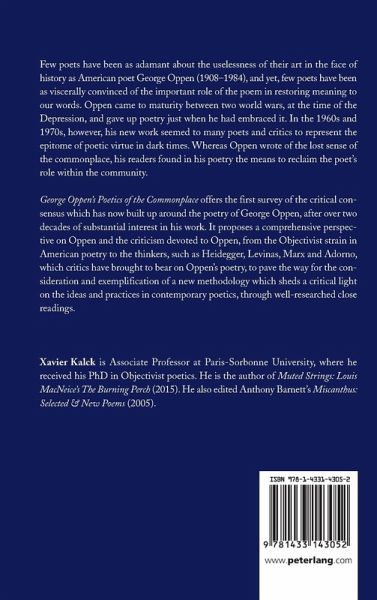 Few poets have been as adamant about the uselessness of their art in the face of history as American poet George Oppen (1908-1984), and yet, few poets have been as viscerally convinced of the important role of the poem in restoring meaning to our words. Oppen came to maturity between two world wars, at the time of the Depression, and gave up poetry just when he had embraced it. In the 1960s and 1970s, however, his new work seemed to many poets and critics to represent the epitome of poetic virtue in dark times. Whereas Oppen wrote of the lost sense of the commonplace, his readers found in his poetry the means to reclaim the poet's role within the community.