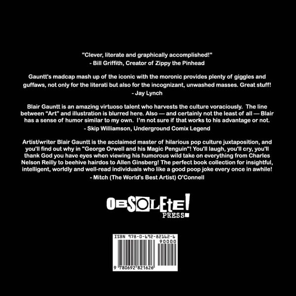 George Orwell and His Magic Penduin (abridged) 102 pages Published by Obsolete! Press Blair Gauntt has pried open the top of his head and craziness has spilled out in the form of a new book of cartoons called George Orwell and His Magic Penguin. Gauntt has a unique vision of contemporary humor and culture, finding connections between the highbrow and the lowbrow that will have you knitting your own brows as you double over with laughter. With a unique drawing style, this singular talent skewers pop culture icons and luminaries from classic literature in equal fashion. "Clever, literate and graphically accomplished." -Bill Griffith, creator of Zippy the Pinhead "Blair Gauntt is an amazing virtuoso talent who harvests the culture voraciously. The line between 'Art' and illustration is blurred here. Also-and certainly not the least of all-Blair has a sense of humor similar to my own. I'm not sure if that works to his advantage or not." -Skip Williamson, Underground Comix Legend "Artist/writer Blair Gauntt is the acclaimed master of hilarious pop culture juxtaposition, and you'll find out why in "George Orwell and his Magic Penguin"! You'll laugh, you'll cry, you'll thank God you have eyes when viewing his humorous wild take on everything from Charles Nelson Reilly to beehive hairdo's to Allen Ginsberg! The perfect book collection for insightful, intelligent, worldly and well read individuals who like a good poop joke every once in awhile!" - Mitch (The World's Best Artist) O'Connel "Gauntt's madcap mash up of the iconic with the moronic provides plenty of giggles and guffaws, not only for the literati but also for the incognizant, unwashed masses. Great stuff!" -Jay Lynch