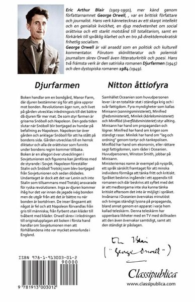 Boken handlar om en bondgård, Manor Farm, där djuren bestämmer sig för att göra uppror mot bonden. Revolutionen äger rum, och livet på gården utvecklas inledningsvis till det bättre då djuren får mer mat. De som styr farmen är grisarna Snöboll och Napoleon. Den goda tiden slutar när Snöboll blir bortjagad av hundar på befallning av Napoleon. Napoleon tar över gården och anklagar Snöboll för att ha stått på bondens sida. Gården utvecklas till en hemsk diktatur och alla de orättvisor som funnits under bondens regim kommer tillbaka. Boken är en allegori över utvecklingen i Sovjetunionen och figurerna kan jämföras med de styrande i Sovjet: Napoleon föreställer Stalin och Snöboll Trotskij som blev bortjagad från Sovjetunionen och sedan dödades. Undantaget är dock att det var Lenin och inte Stalin som tillsammans med Trotskij ansvarade för ryska revolutionen. Inga av djuren kommer ihåg hur det var innan de jagade iväg bonden men de utgår från att det är bättre nu när bonden är bortdriven. De inser långsamt att något är fel och att Napoleon förvandlas från gris till människa; från fyrbent utan kläder till tvåbent med kläder. Orwell skrev i inledningen till originalupplagan att boken i första hand handlar om Sovjetunionen men att förhållandena inte var mycket annorlunda i England.Samhället Oceanien som huvudpersonen lever i är en totalitär stat i ständiga krig och i svår fattigdom. Fyra myndigheter som kallas Minisann (sanningsministeriet), Minifred (fredsministeriet), Minilek (kärleksministeriet) och Miniflöd (överflödsministeriet) styr allting. Minisann har hand om propagandan och lögner. Minifred har hand om krigen som ständigt rasar. Minilek har hand om "lag och ordning" genom tortyr och tankepolisen. Miniflöd har hand om ekonomin, eller rättare sagt fattigdomen, som råder i Oceanien. Huvudpersonen, Winston Smith, jobbar på Minisann. Ministeriernas namn är exempel på nyspråk, ett språk särskilt framtaget för att minska individens förmåga att tänka fritt och kritiskt. Språket beskrivs ingående i ett appendix till romanen och där beskrivs att syftet med det är att medborgarna inte ska kunna tänka kritiskt eftersom det inte är möjligt i språket. Invånarna i Oceanien övervakas minutiöst och tvingas ständigt lyssna på propaganda, bland annat genom en apparat i varje hem kallad teleskärm. Denna teleskärm har uppenbara likheter med en TV med skillnaden att den även övervakar samtidigt, samt att den ständigt är påslagen.