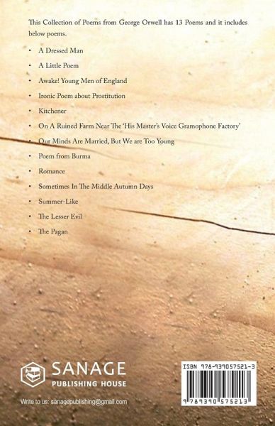 This Collection of Poems from George Orwell has 13 Poems and it includes below poems. · A Dressed Man · A Little Poem · Awake! Young Men of England · Ironic Poem about Prostitution · Kitchener · On A Ruined Farm Near The 'His Master's Voice Gramophone Factory' · Our Minds Are Married, But We are Too Young · Poem from Burma · Romance · Sometimes In The Middle Autumn Days · Summer-Like · The Lesser Evil · The Pagan