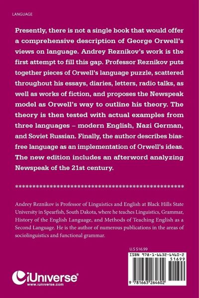Presently, there is not a single book that would offer a comprehensive description of George Orwell's views on language. Andrey Reznikov's work is the first attempt to fill this gap. Professor Reznikov puts together pieces of Orwell's language puzzle, scattered throughout his essays, diaries, letters, radio talks, as well as works of fiction, and proposes the Newspeak model as Orwell's way to outline his theory. The theory is then tested with actual examples from three languages - modern English, Nazi German, and Soviet Russian. Finally, the author describes bias-free language as an implementation of Orwell's ideas. The new edition includes an afterword analyzing Newspeak of the 21st century.