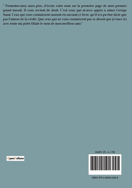 George Sand, nom de plume d'Amantine Aurore Lucile Dupin de Francueil, par mariage baronne Dudevant, est une romancière, dramaturge, épistolière, critique littéraire et journaliste française, née à Paris le 1er juillet 1804 et morte au château de Nohant-Vic le 8 juin 1876. Elle compte parmi les écrivains les plus prolifiques, avec plus de 70 romans à son actif et 50 volumes d'¿uvres diverses dont des nouvelles, des contes, des pièces de théâtre et des textes politiques. À l'image de son arrière-grand-mère, Louise Dupin, qu'elle admire, George Sand prend la défense des femmes, prône la passion, fustige le mariage et lutte contre les préjugés d'une société conservatrice. Extrait : " Permettez moi, mon père, d¿écrire votre nom sur la première page de mon premier grand travail. Il vous revient de droit. C¿est vous qui m¿avez appris à aimer George Sand. Ceux qui vous connaissent sauront en ouvrant ce livre, qüil n¿a pu être dicté que par l¿amour de la vérité. Que ceux qui ne vous connaissent pas se disent que je trace ici avec toute ma piété filiale le nom de mon meilleur ami."
