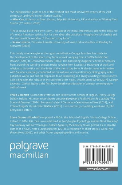 .- 1 "A Job to Do": George Saunders on, and at, Work.- 2 Horning In: Language, Subordination and Freedom in the Short Fiction of George Saunders.- 3 Language Between Lyricism and Corporatism: George Saunders's New Sincerity.- 4 "Hope that, in future, all is well": American Exceptionalism and Hopes for Resistance in Two Stories by George Saunders.- 5 Hanging by a Thread in the Homeland: The Four Institutional Monologues of George Saunders.- 6 Biopolitical Dystopias, Bureaucratic Carnivores, Synthetic Primitives: "Pastoralia" as Human Zoo.- 7 Ghosts and Theme Parks: The Supernatural and the Artificial in George Saunders's Short Stories.- 8 The Absent Presence of the Deus Absconditus in the Work of George Saunders.- 9 Narrative Empathy in George Saunders's Short Fiction.- 10 Cruel Inventions: George Saunders's Literary Darkenfloxx(TM).- 11 Dreaming and Realizing "The Semplica Girl Diaries": A Post-Jungian Reading.- 12 Everyday Zombies: Ethics and the Contemporary in George Saunders's "Sea Oak" and "Brad Carrigan, American".- 13 "Third Person Ventriloquism": Microdialogues and Polyphony in George Saunders's "Victory Lap".- 14 "A little at a time. And Iteratively": A Conversation with George Saunders.