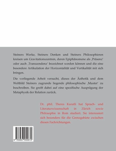 Steiners Werke, Steiners Denken und Steiners Philosophieren kreisen um Gravitationszentren, deren Epiphänomene als 'Präsenz' oder auch 'Transzendenz' bezeichnet werden können und die eine besondere Artikulation der Horizontalität und Vertikalität mit sich bringen. Die vorliegende Arbeit versucht, dieses der Ästhetik und dem Weltbild Steiners zugrunde liegende philosophische 'Muster' zu beschreiben. Sie greift dabei auf eine spezifische Ausprägung der Metaphysik der Relation zurück.