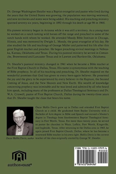 Dr. George Washington Sheafor was a Baptist evangelist and pastor who lived during the years that the United States was growing, the population was moving westward, and new territories and states were being added. His teaching and preaching ministry spanned seventy-six years, beginning in 1892 through his death at age 96 in 1968. His pioneer ministry began in Arizona while it was still a territory. As a young man he worked on a ranch taming wild horses off the range and preached to some of the ranch hands with whom he worked. He attended Moody Bible Institute in Chicago, Illinois, and was mentored by Dwight L. Moody, the great evangelist of his day. He also studied the life and teachings of Andrew Murray and patterned his life after this great English teacher and preacher. He began preaching revival meetings in Nebraska, Kansas, Oklahoma and Texas. During his pastoral ministry, he served in Comanche and Brownwood, Texas; Lawton, Oklahoma; and in Lancaster, Texas. Dr. Sheafor's pastoral ministry changed in 1941 when he became a Bible teacher at the First Baptist Church in Dallas, Texas. His name is synonymous with the teaching of Bible prophecy. In all of his teaching and preaching, Dr. Sheafor majored on the wonderful promises that God has given to every born-again believer. He presented the joy and the glory to be experienced by every believer in the Rapture, the Second Coming of Jesus, and the New Heaven and New Earth. His wealth of knowledge concerning prophecy was inimitable and he was loved and admired by all who heard him speak, including many of the professors at Dallas Theological Seminary and Dr. W.A. Criswell, pastor of First Baptist Church, Dallas for all of the twenty-three years that Dr. Sheafor taught the class that now bears his name.