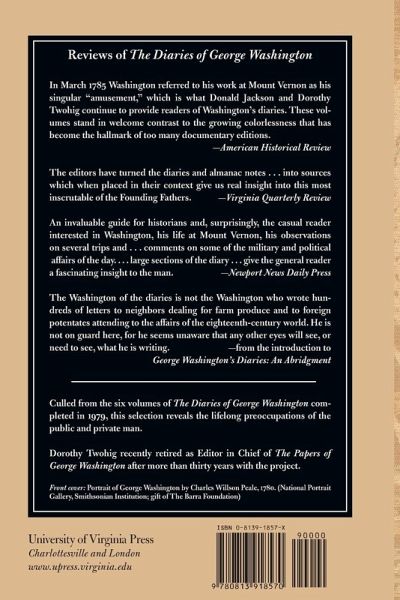 CULLED FROM the six volumes of The Diaries of George Washington completed in 1979, this selection of entries chosen by retired Washington Papers editor Dorothy Twohig reveals the lifelong preoccupations of the public and private man. Washington was rarely isolated from the world during his eventful life. His diary for 1751-52 relates a voyage to Barbados when he was nineteen. The next two accounts concern the early phases of the French and Indian War, in which Washington commanded a Virginia regiment. By the 1760s when Washington's diaries resume, he considered himself retired from public life, but George III was on the British throne and in the American colonies the process of unrest was beginning that would ultimately place Washington in command of a revolutionary army.