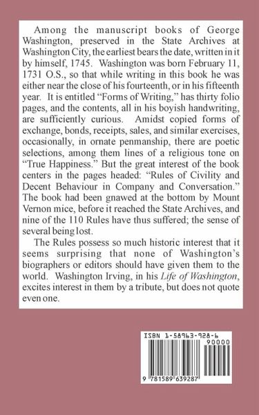 "George Washington's Rules of Civility" by Moncure D. Conway, first published in 1890, is a study of the history of the 110 principles or maxims which were written out by hand by George Washington as a young man and preserved in the Washington archives. These principles were copied out by Washington in 1745 and were titled "Rules of Civility and Decent Behaviour in Company and Conversation". They are guidelines by which proper and decent people should abide and include instruction on proper dress, how to behave in pleasant company, general manners and courtesies, and how to act in formal situations. Washington was deeply influenced by these rules and his character throughout his adult life was defined by their insistence on proper decorum and courtesy. Conway traces the history of these guidelines and in his exhaustive research finds their origin in a French treatise published in 1595. The maxims were then translated into Latin and eventually published in English in 1640. The author researches Washington's early education and posits how and by whom the future leader may have been introduced to these influential and formative principles. Conway's "George Washington's Rules of Civility" provides an important historical context to the influences that shaped the character of America's first president. This edition is printed on premium acid-free paper.