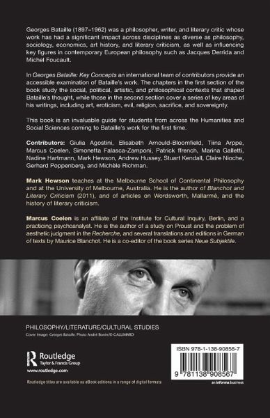 Introduction Mark Hewson and Marcus Coelen Part 1: Contexts 1. Surrealism Marina Galletti 2. Sociology and Ethnography Simonetta Falasca-Zamponi 3. Fascism and the Politics of the 1930s in France Andrew Hussey 4. Nietzsche Giulia Agostini Part 2: Key Concepts 5. Expenditure Stuart Kendall 6. Heterology Marcus Coelen 7. Sacrifice Elisabeth Arnould-Bloomfield 8. Inner Experience Gerhard Poppenberg 9. Sovereignty Claire Nioche 10. Eroticism Nadine Hartmann 11. Art Michèle Richman 12. Religion Mark Hewson 13. Evil Tiina Arppe 14. Bataille's Literary Writings Patrick ffrench. Index