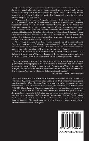 (Anna Rocca, Salem State University)"L'analyse historique, sociale, littéraire et critique des textes de Georges Henein qu'Evelyne M. Bornier propose se veut la valorisation indispensable d'un auteur encore peu connu au regard de la production littéraire francophone d'Égypte. Bornier cerne de façon très convaincante la force révolutionnaire d'Henein, écrivain surréaliste dont le but est d'oeuvrer à la libération de la conscience humaine."