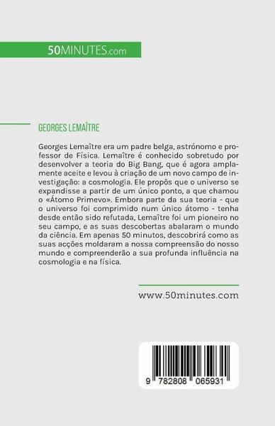 Georges Lemaître era um padre belga, astrónomo e professor de Física. Lemaître é conhecido sobretudo por desenvolver a teoria do Big Bang, que é agora amplamente aceite e levou à criação de um novo campo de investigação: a cosmologia. Ele propôs que o universo se expandisse a partir de um único ponto, a que chamou o "Átomo Primevo". Embora parte da sua teoria - que o universo foi comprimido num único átomo - tenha desde então sido refutada, Lemaître foi um pioneiro no seu campo, e as suas descobertas abalaram o mundo da ciência. Em apenas 50 minutos, descobrirá como as suas acções moldaram a nossa compreensão do nosso mundo e compreenderão a sua profunda influência na cosmologia e na física. Este livro simples e informativo proporciona uma discussão aprofundada das descobertas científicas mais importantes de Lemaître, incluindo a sua teoria do Big Bang e a sua teoria sobre a expansão do universo. Apresenta também uma biografia completa, uma introdução valiosa ao contexto político, social e económico e uma avaliação do impacto do seu trabalho, dando-lhe toda a informação essencial sobre este pioneiro na ciência. Sobre Georges Lemaître : Georges Lemaître foi um padre e astrónomo belga que criou uma das teorias mais famosas da ciência moderna - o Big Bang - que mudou completamente a forma como consideramos a história do nosso universo. No entanto, Lemaître não inventou o próprio termo "Big Bang" - um dos seus críticos cunhou a expressão quando a disse numa entrevista de rádio, a fim de a tornar mais acessível ao público.
