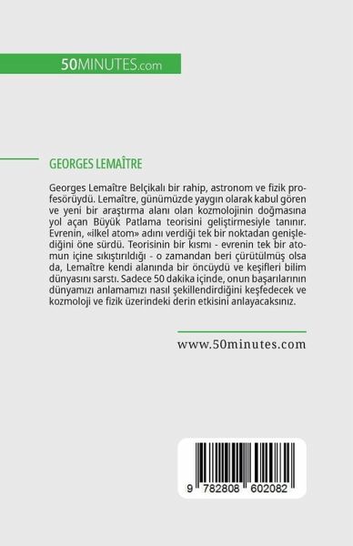 Georges Lemaître Belçikal¿ bir rahip, astronom ve fizik profesörüydü. Lemaître, günümüzde yayg¿n olarak kabul gören ve yeni bir arät¿rma alan¿ olan kozmolojinin do¿mas¿na yol açan Büyük Patlama teorisini geli¿tirmesiyle tan¿n¿r. Evrenin, "ilkel atom" ad¿n¿ verdi¿i tek bir noktadan geni¿ledi¿ini öne sürdü. Teorisinin bir k¿sm¿ - evrenin tek bir atomun içine s¿k¿¿t¿r¿ld¿¿¿ - o zamandan beri çürütülmü¿ olsa da, Lemaître kendi alan¿nda bir öncüydü ve ke¿ifleri bilim dünyas¿n¿ sarst¿. Sadece 50 dakika içinde, onun bäar¿lar¿n¿n dünyam¿z¿ anlamam¿z¿ nas¿l ¿ekillendirdi¿ini ke¿fedecek ve kozmoloji ve fizik üzerindeki derin etkisini anlayacaks¿n¿z. Bu sade ve bilgilendirici kitap, Lemaître'in Büyük Patlama teorisi ve evrenin geni¿lemesi teorisi de dahil olmak üzere en önemli bilimsel ke¿iflerinin kapsaml¿ bir tart¿¿mas¿n¿ sunmaktad¿r. Bu kitap ayn¿ zamanda tam bir biyografi, siyasi, sosyal ve ekonomik bälamla ilgili de¿erli bir giri¿ ve çal¿¿malar¿n¿n etkisinin bir de¿erlendirmesini de içermekte ve size bilimin bu öncüsü hakk¿nda tüm temel bilgileri vermektedir. Georges Lemaître Hakk¿nda Georges Lemaître, çädä bilimin en ünlü teorilerinden biri olan ve evrenimizin tarihini ele al¿¿ biçimimizi tamamen de¿i¿tiren Büyük Patlama'y¿ yaratan Belçikal¿ bir rahip ve astronomdu. Bununla birlikte, Lemaître "Büyük Patlama" terimini kendisi icat etmedi - bir radyo röportaj¿ s¿ras¿nda halk¿n daha kolay anlayabilmesi için bu ifadeyi kulland¿¿¿nda onu ele¿tirenlerden biri bu terimi uydurdu
