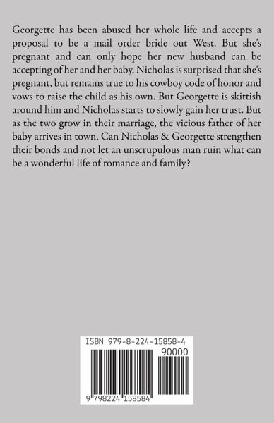 Georgette has been abused her whole life and accepts a proposal to be a mail order bride out West. But she's pregnant and can only hope her new husband can be accepting of her and her baby. Nicholas is surprised that she's pregnant, but remains true to his cowboy code of honor and vows to raise the child as his own. But Georgette is skittish around him and Nicholas starts to slowly gain her trust. But as the two grow in their marriage, the vicious father of her baby arrives in town. Can Nicholas & Georgette strengthen their bonds and not let an unscrupulous man ruin what can be a wonderful life of romance and family?