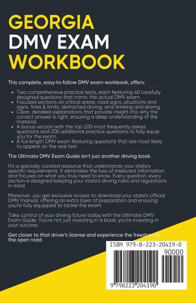 The Ultimate DMV Exam Guide is Your Roadmap to First-Attempt SuccessFeeling the pressure of the upcoming DMV test? In search of a tool that simplifies the process, boosts your confidence, and increases your chances of success? Want to ace the driving test on your first attempt? This comprehensive guide is your go-to resource, packed with original test questions crafted to mirror the real DMV exam, taking the uncertainty out of your preparation. This complete, easy-to-follow DMV exam workbook, offers: Two comprehensive practice tests, each featuring 40 carefully designed questions that mimic the actual DMV exam. Focused sections on critical areas: road signs, situations and signs, fines & limits, distracted driving, and drinking and driving. Clear, detailed explanations that provide insight into why the correct answer is right, ensuring a deep understanding of the material. A bonus section with the top 100 most frequently asked questions and 200 additional practice questions to fully equip you for the exam. A full-length DMV exam featuring questions that are most likely to appear on the real test. The Ultimate DMV Exam Guide isn't just another driving book. It's a specially curated resource that understands your state's specific requirements. It eliminates the fuss of irrelevant information and focuses on what you truly need to know. Every question and every section is designed keeping your state's driving rules and regulations in mind. Moreover, you get exclusive access to download your state's official DMV manual, offering an extra layer of preparation and ensuring you're fully equipped to tackle the exam. Take control of your driving future today with the Ultimate DMV Exam Guide. You're not just investing in a book; you're investing in your success. Get closer to that driver's license and experience the freedom of the open road. Order your copy today and embark on your journey to DMV test success!