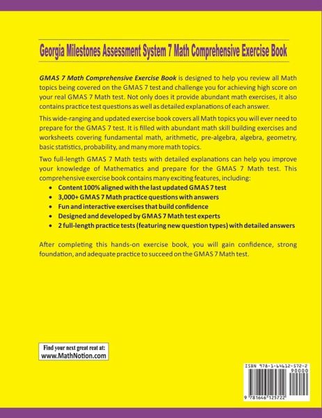 Do NOT take the GMAS Math test without reviewing the Math questions in this Exercise book! GMAS Math Comprehensive Exercise Book is designed to help you review all Math topics being covered on the GMAS test and challenge you for achieving high score on your real GMAS Math test. Not only does it provide abundant math exercises, it also contains practice test questions as well as detailed explanations of each answer. This wide-ranging and updated exercise book covers all Math topics you will ever need to prepare for the GMAS test. It is filled with abundant math skill building exercises and worksheets covering fundamental math, arithmetic, pre-algebra, algebra, geometry, basic statistics, probability, and many more math topics. Answers are provided for all questions. Two full-length GMAS Math tests with detailed explanations can help you improve your knowledge of Mathematics and prepare for the GMAS Math test. This comprehensive exercise book contains many exciting features, including: * Content 100% aligned with the last updated GMAS test * 3,000+ GMAS Math practice questions with answers * Fun and interactive exercises that build confidence * Designed and developed by GMAS Math test experts * 2 full-length practice tests (featuring new question types) with detailed answers After completing this hands-on exercise book, you will gain confidence, strong foundation, and adequate practice to succeed on the GMAS Math test. Get ready for the GMAS Math Test with a PERFECT Math Exercise Book! Published By: Math Notion WWW.MathNotion.com