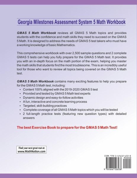 The only prep book you will ever need to ace the Georgia Milestones Assessment System Math Test! GMAS Math Workbook reviews all GMAS Math topics and provides students with the confidence and math skills they need to succeed on the GMAS Math. It is designed to address the needs of GMAS test takers who must have a working knowledge of basic Mathematics. This comprehensive workbook with over 2,500 sample questions and 2 complete GMAS tests can help you fully prepare for the GMAS Math test. It provides you with an in-depth focus on the math portion of the exam, helping you master the math skills that students find the most troublesome. This is an incredibly useful tool for those who want to review all topics being covered on the GMAS Math test. GMAS Math Workbook contains many exciting features to help you prepare for the GMAS Math test, including: * Content 100% aligned with the 2019-2020 GMAS test * Provided and tested by GMAS Math test experts * Dynamic design and easy-to-follow activities * A fun, interactive and concrete learning process * Targeted, skill-building practices * Complete coverage of all GMAS Math topics which you will be tested * 2 full-length practice tests (featuring new question types) with detailed answers. * Published By: Math Notion WWW.MathNotion.com
