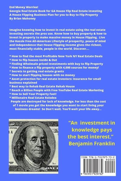 End Money Worries! Georgia Real Estate Book for GA House Flip Real Estate Investing A House Flipping Business Plan for you to Buy to Flip Property By Brian Mahoney Imagine knowing how to invest in real estate using the real estate investing secrets the pros use. Know how to buy property & how to invest in property to make massive money in House Flipping. Live the Hassle Free All-American Lifestyle of prosperity, peace of mind and independence that House Flipping income gives the richest, most financially stable, people in the world. Discover.... * How to find the most Profitable Georgia GA Real Estate Deals * How to flip houses Inside & Out * Finding Wholesale priced Investments with buy to flip Property * How to finance a flip property with 4,000 sources for money! * Secrets to getting real estate grants * How to start flipping houses with no money * Asset protection for real estate investors: Insurance for small business explained * Best way to Rehab Real Estate Rehab House * Reach a Billion People with Free YouTube Real Estate Marketing * How to Sell Your Property Fast! * Millionaire Real Estate Rolodex People are destroyed for lack of knowledge. For less than the cost of 1 movie you get the knowledge you want to start living your business dreams! So Don't wait. You'll wait your life away...