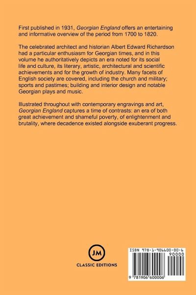 First published in 1931, Georgian England offers an entertaining and informative overview of the period from 1700 to 1820. The celebrated architect and historian Albert Edward Richardson had a particular enthusiasm for Georgian times, and in this volume he authoritatively depicts an era noted for its social life and culture, its literary, artistic, architectural and scientific achievements and for the growth of industry. Many facets of English society are covered, including the church and military; sports and pastimes; building and interior design and notable Georgian plays and music. Illustrated throughout with contemporary engravings and art, Georgian England captures a time of contrasts: an era of both great achievement and shameful poverty, of enlightenment and brutality, where decadence existed alongside exuberant progress.