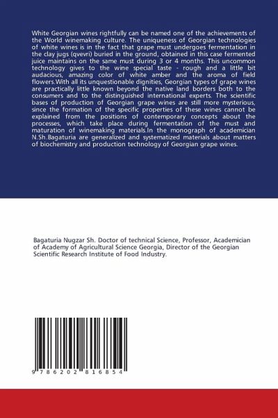 White Georgian wines rightfully can be named one of the achievements of the World winemaking culture. The uniqueness of Georgian technologies of white wines is in the fact that grape must undergoes fermentation in the clay jugs (qvevri) buried in the ground, obtained in this case fermented juice maintains on the same must during 3 or 4 months. This uncommon technology gives to the wine special taste - rough and a little bit audacious, amazing color of white amber and the aroma of field flowers.With all its unquestionable dignities, Georgian types of grape wines are practically little known beyond the native land borders both to the consumers and to the distinguished international experts. The scientific bases of production of Georgian grape wines are still more mysterious, since the formation of the specific properties of these wines cannot be explained from the positions of contemporary concepts about the processes, which take place during fermentation of the must and maturationof winemaking materials.In the monograph of academician N.Sh.Bagaturia are generalized and systematized materials about matters of biochemistry and production technology of Georgian grape wines.