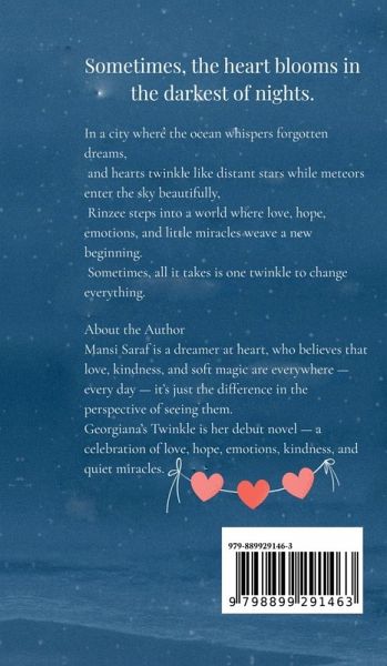 When Rinzee moves to the dreamy city of Georgiana-where beaches meet snowfall and silence holds stories-she doesn't know what awaits her. All she knows is that something inside her is changing. In this coming-of-age tale wrapped in romance and wonder, Georgiana's Twinkle captures a journey of healing, hope, and unexpected miracles. Through quiet realizations and moments that sparkle like stardust, Rinzee begins to understand what love truly means. She faces questions she never knew she had and finds that sometimes, the most beautiful things happen without warning. As she navigates new friendships, buried emotions, and the unknown magic of connection, Rinzee learns that someone-sometimes even a stranger-can make life feel lighter, brighter... like a twinkle in the heart.