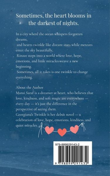 When Rinzee moves to the dreamy city of Georgiana-where beaches meet snowfall and silence holds stories-she doesn't know what awaits her. All she knows is that something inside her is changing. In this coming-of-age tale wrapped in romance and wonder, Georgiana's Twinkle captures a journey of healing, hope, and unexpected miracles. Through quiet realizations and moments that sparkle like stardust, Rinzee begins to understand what love truly means. She faces questions she never knew she had and finds that sometimes, the most beautiful things happen without warning. As she navigates new friendships, buried emotions, and the unknown magic of connection, Rinzee learns that someone-sometimes even a stranger-can make life feel lighter, brighter... like a twinkle in the heart.