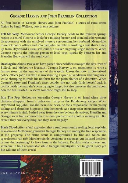 All four books in 'Georgie Harvey And John Franklin', a series of rural crime fiction by Sandi Wallace, now in one volume! Tell Me Why: Melbourne writer Georgie Harvey heads to the mineral springs region in central Victoria to look for a missing farmer, and soon links the woman's disappearance with the unsolved mystery surrounding her husband. Meanwhile, maverick police officer and solo dad John Franklin is working a case that's a step up from Daylesford's usual soft crime: a stalker targeting single mothers. When Georgie reports the missing person to local cops, sparks fly between her and Franklin. But what will the truth cost? Dead Again: Almost two years have passed since wildfires ravaged the tiny town of Bullock, and Melbourne journalist Georgie Harvey is on assignment to write a feature story on the anniversary of the tragedy. Across the state in Daylesford, police officer John Franklin is investigating a spree of vandalism and burglaries, while champing to trade his uniform for the plain clothes of a detective. When Georgie's story and Franklin's cases collide, she not only finds herself back in conflict with the man she's been trying to forget, but also uncovers the truth about how the fires started... A secret someone might kill to keep. Into The Fog: Melbourne journalist Georgie Harvey is on hand when three children disappear from a police-run camp in the Dandenong Ranges. When Daylesford cop John Franklin hears the news, he feels responsible for the young siblings and abandons his post to join the search. As a snap polar storm intensifies, every minute is vital. Pushed away from the case by local detectives, Franklin and Georgie soon find a connection to a serial predator and another missing girl. But even if they risk everything, can they avert tragedy? Black Cloud: After a fatal explosion that a rural community reeling, local cop John Franklin and Melbourne journalist Georgie Harvey are among the first responders at the property. The crime scene is compromised by fire and water, and speculations run rife. Murder-suicide? Accident or sabotage? An isolated incident or just the beginning? As lives hang in the balance, Franklin seeks answers and someone to hold accountable while Georgie investigates her toughest story yet. But will one of them crack?