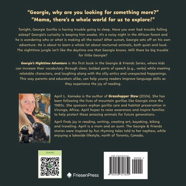 April L. Kameka is the author of Grasshopper Stew (2024). She has been following the lives of mountain gorillas like Georgie since the 1980s. She sponsors orphan gorilla care and habitat preservation in Virunga, Africa. April hopes to raise awareness and inspire families to help protect these amazing animals for future generations. April finds joy in reading, writing, creating art, kayaking, biking and traveling. April is a mom and an aunt. The Georgie & Friends stories were inspired by fun rhyming tales told to her nephew, while enjoying a lakeside lifestyle, north of Toronto, Canada.