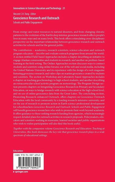 The contributors - academics, research scientists, science educators and outreach program educators - describe and evaluate outreach programs from around the world. A section entitled Field-based Approaches includes a chapter describing an initiative to engage Alaskan communities and students in research, and another on problem-based learning in the field setting. The Online Approaches section discusses ways to connect students and scientists using online forums; use of the web and social media, including the United Nations University and its experience with the design of a web magazine featuring geoscience research; and video clips on marine geoscience created by students and scientists. The section on Workshop and Laboratory-based Approaches includes a chapter on teaching geochronology to high school students, and another describing an extracurricular school activity program on meteorology. The Program Design section presents chapters on Integrating Geoscience Research in Primary and Secondary Education, on ways to bridge research with science education at the high school level, and on use of online geoscience data from the Great Lakes. The concluding section, Promoting Research-enhanced Outreach, offers chapters on Geoscience Outreach Education with the local community by a leading research-intensive university, and on the use of research to promote action in Earth science professional development for schoolteachers.Geoscience Research and Outreach: Schools and Public Engagement will benefit geoscience researchers who wish to promote their work beyond academia. It offers guidance to those seeking research funding from agencies, which increasingly request detailed plans for outreach activities in research proposals. Policymakers, educators and scientists working in museums, learned societies and public organizations who wish to widen participation will also find this book useful.