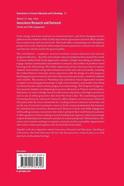 The contributors - academics, research scientists, science educators and outreach program educators - describe and evaluate outreach programs from around the world. A section entitled Field-based Approaches includes a chapter describing an initiative to engage Alaskan communities and students in research, and another on problem-based learning in the field setting. The Online Approaches section discusses ways to connect students and scientists using online forums; use of the web and social media, including the United Nations University and its experience with the design of a web magazine featuring geoscience research; and video clips on marine geoscience created by students and scientists. The section on Workshop and Laboratory-based Approaches includes a chapter on teaching geochronology to high school students, and another describing an extracurricular school activity program on meteorology. The Program Design section presents chapters on Integrating Geoscience Research in Primary and Secondary Education, on ways to bridge research with science education at the high school level, and on use of online geoscience data from the Great Lakes. The concluding section, Promoting Research-enhanced Outreach, offers chapters on Geoscience Outreach Education with the local community by a leading research-intensive university, and on the use of research to promote action in Earth science professional development for schoolteachers.Geoscience Research and Outreach: Schools and Public Engagement will benefit geoscience researchers who wish to promote their work beyond academia. It offers guidance to those seeking research funding from agencies, which increasingly request detailed plans for outreach activities in research proposals. Policymakers, educators and scientists working in museums, learned societies and public organizations who wish to widen participation will also find this book useful.