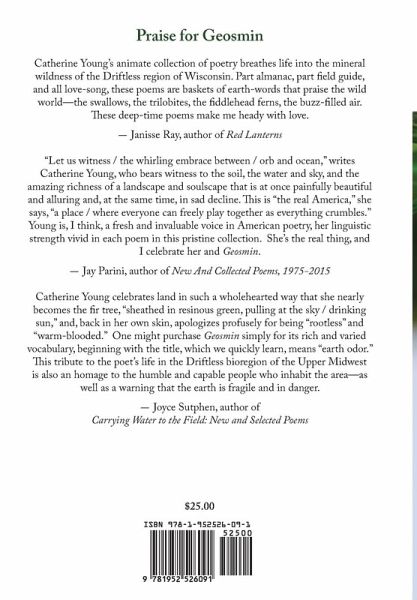 The poems of Geosmin (the scent of soil) are celebration of the startling and shimmering earth, praising creatures of soil, sky, and in-between. Ecologist, farmer, mother, and poet Catherine Young honors land and what it means to be human in this world. Her poems journey through earth, water, tree, and stone, the heartbreak and beauty of seasons across a rural year, and take a panoramic view of aging. Young paints a deep map of Wisconsin's Driftless region while evoking a place found within regions of the heart.
