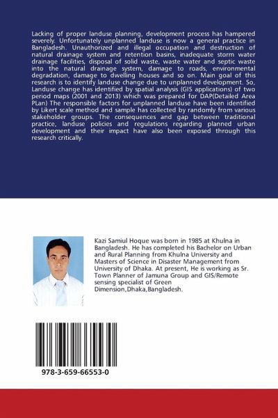 Lacking of proper landuse planning, development process has hampered severely. Unfortunately unplanned landuse is now a general practice in Bangladesh. Unauthorized and illegal occupation and destruction of natural drainage system and retention basins, inadequate storm water drainage facilities, disposal of solid waste, waste water and septic waste into the natural drainage system, damage to roads, environmental degradation, damage to dwelling houses and so on. Main goal of this research is to identify landuse change due to unplanned development. So, Landuse change has identified by spatial analysis (GIS applications) of two period maps (2001 and 2013) which was prepared for DAP(Detailed Area PLan) The responsible factors for unplanned landuse have been identified by Likert scale method and sample has collected by randomly from various stakeholder groups. The consequences and gap between traditional practice, landuse policies and regulations regarding planned urban development and their impact have also been exposed through this research critically.