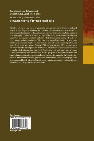 Foreword.- Section I - General Considerations in Geospatial Analysis of Environmental Health.- 1.Environmental Health and Geospatial Analysis: An Overview.- 2. Using GeoVisualization and Geospatial Analysis to Explore Respiratory Disease and Environmental Health Justice in New York City.- 3. Outdoor Air Pollution and Health - A review of the Contributions of Geotechnologies to Exposure Assessment.- 4. The Use of Residential History in Environmental Health Studies.- 5. Proximity Analysis Methods for Exposure Assessment in Environmental Health Justice Research.- Section II - Impacts on Environmental Health (Topical Case Studies).- 7. Geospatial analysis of West Nile virus (WNV) incidences in an urban environment: A Case Study in the Twin Cities Metropolitan Area of Minnesota.- 8. The Health Impacts of Brownfields in Charlotte NC: A Spatial Approach.- 9. Regional Environmental Patterns of Diarrheal Disease in Bangladesh: A Spatial Analytical and Multilevel Approach.- 10. Developing a Supermarket Need Index for New York City.- 11. Asthma, Air Quality, and Environmental Justice in Louisville, Kentucky.- 12. The Impact of Changes in Municipal Solid Waste Disposal Laws on Proximity to Environmental Hazards: A Case Study of Connecticut.- 13.Global Geographies of Environmental Injustice and Health: A Case Study of Illegal Hazardous Waste Dumping in Cote d'Ivoire.- 14. Environmental and Health Inequalities of Women in Different Neighbourhoods of Metropolitan Lagos, Nigeria.- 15. Housing Quality and Racial Disparities in Low Birth Weight: A GIS Assessment in Flint, Michigan.- Section III - Geospatial Methods in Investigating Environmental Health.- 16. Participatory mapping as a component of operational malaria vector control in Tanzania.- 17. Revisiting Tobler's First Law of Geography: Spatial Regression Models for Assessing Environmental Justice and Health Risk Disparities.- 18. A Spatially Explicit Environmental Health Surveillance Framework for Tick-Borne Diseases.- 19. Using Distance Decay Techniques and Household-Level Data to Explore Regional Variation in Environmental Inequality.- 20. Merging Satellite Measurement with Ground-based Air Quality Monitoring Data to Assess Health Effects of Fine Particulate Matter Pollution.- 21. Poverty Determinants of Acute Respiratory Infections in the Mapuche Population of Ninth Region of Araucania, Chile (2000-2005). A Bayesian Approach with Time-space Modelling.- 22. GIS and Atmospheric Diffusion Modeling for Assessment of Individual Exposure to Dioxins Emitted from a Municipal Solid Waste Incinerator.- 23. Synthesizing waterborne infection prevalence for comparative analysis of cluster detection methods.- 24. Spatiotemporal Analysis of PM2.5 Exposure in Taipei (Taiwan) by integrating PM10 and TSP observations.- Index.